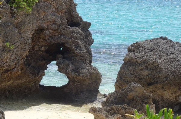 宮古島市内より車で約30分、池間大橋を渡るとたどり着くのが池間島。自然やきれいな海がたくさん残る島です。岩をくりぬいたようなハートが特徴で、干潮のときしか見ることができない、幻のハート!