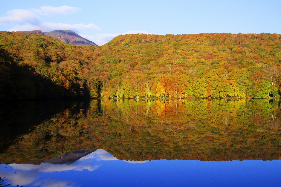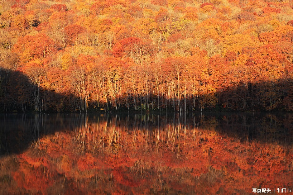 まるでウユニ塩湖だと、話題なのが「蔦沼」です。奥入瀬の玄関口・焼山から北に進むとあり、鏡張りのように紅葉で赤く染まる湖面は絶景です。朝焼けが紅葉の効果もあって、さらに真っ赤に燃えあがります。