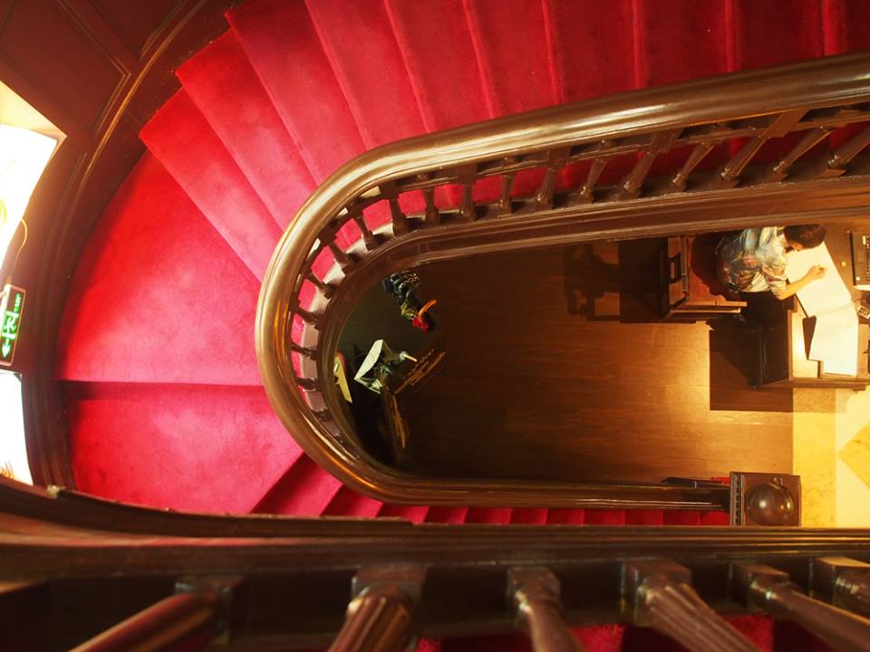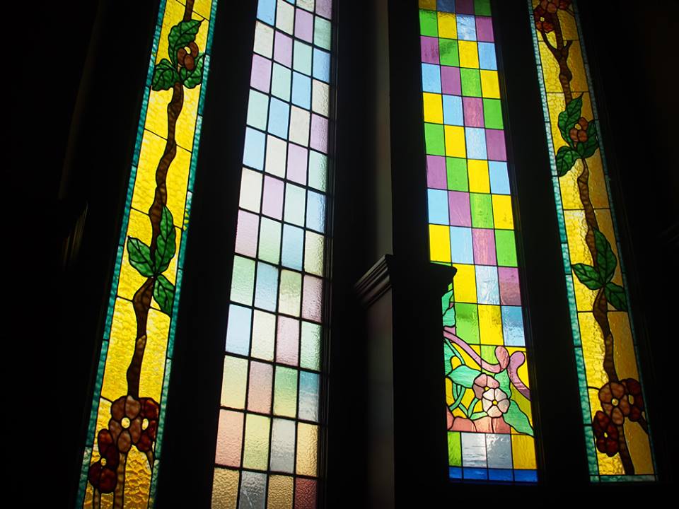 洋館へ一歩足を踏み入れてみると、家具やインテリアなどの調度品もひとつひとつ凝っていて、館内を歩いているだけでもとても楽しく、高貴な気分に!螺旋階段の壁際にあるステンドグラスは当時のままなんだそうです