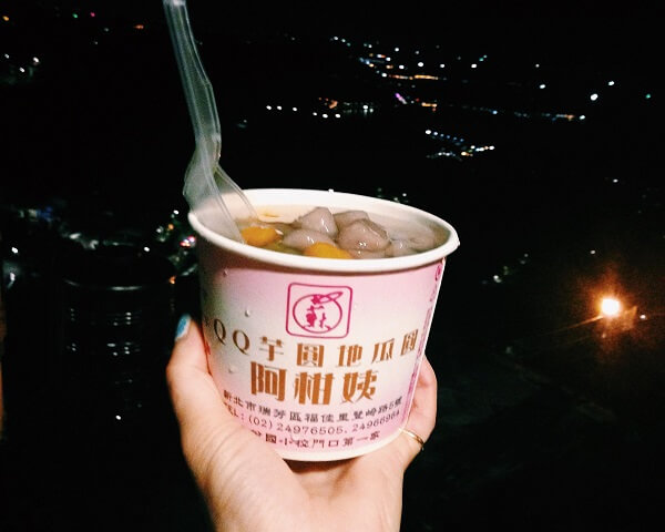 タロイモを使ったお団子入りの冷たい台湾風お汁粉。こちらも日本では食べられるお店が少ない台湾スイーツ。高台にある阿柑姨芋圓はお店の奥の展望席で夜景をバックにフォトジェニックな写真が撮れます。住所:新北市瑞芳區九份