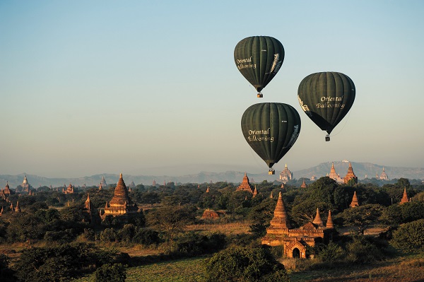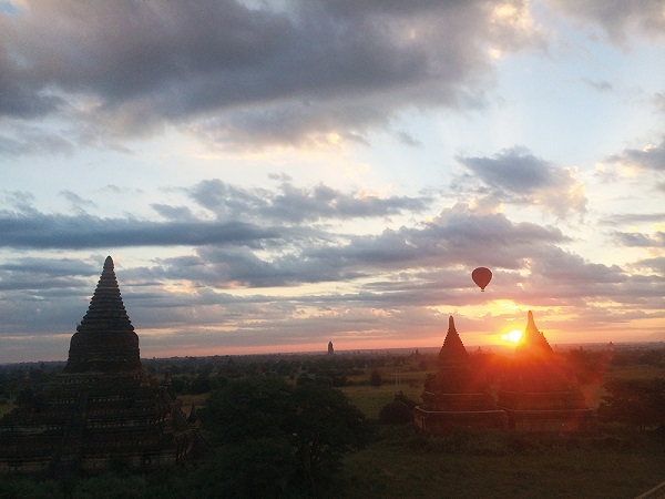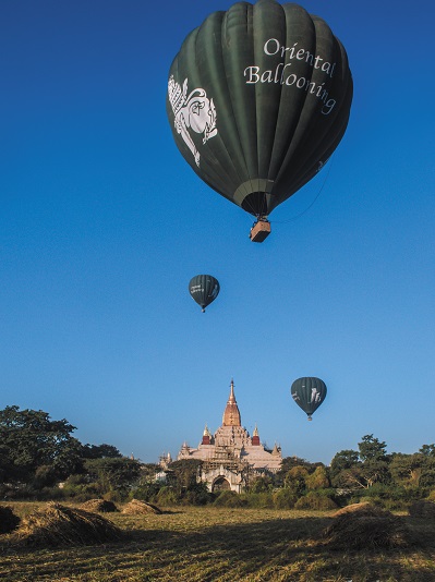 99%の予約率なので、事前予約・手配は必須ですが、早朝・日の出とともにバガン遺跡の上空に浮かび上がり、朝焼けに染まるバガン遺跡群を眼下に一望することができます。
