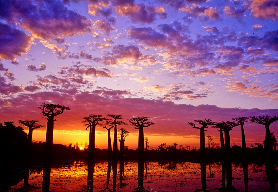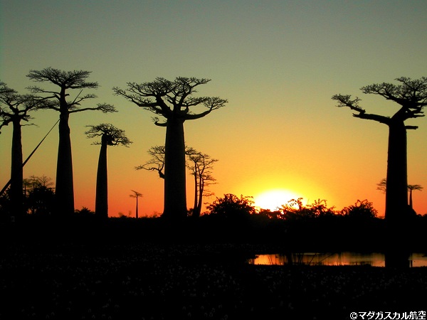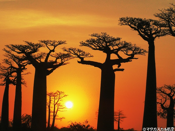 夕陽に染まる一帯に、バオバブの不思議なシルエットが続く光景は、マダガスカル島で必見!まさに絶景です。
