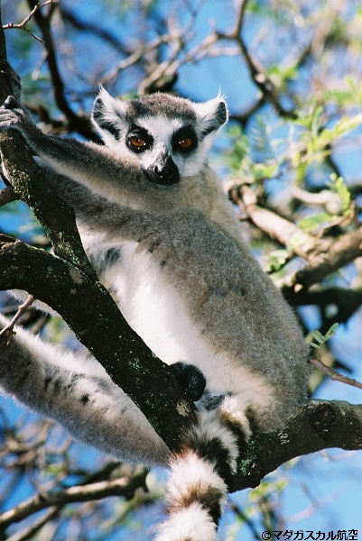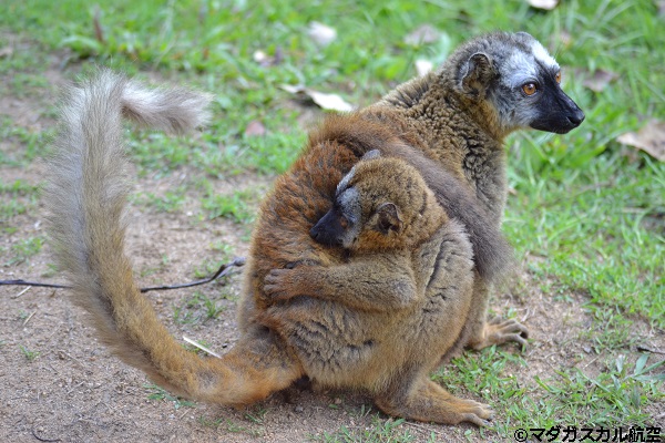 マダガスカル固有種のサル。トレードマークの縞模様のしっぽは体長より長く約50cm~60cm。チャイロキツネザルとは逆に、多くは地上で活動します。マダガスカル航空.jpg)
