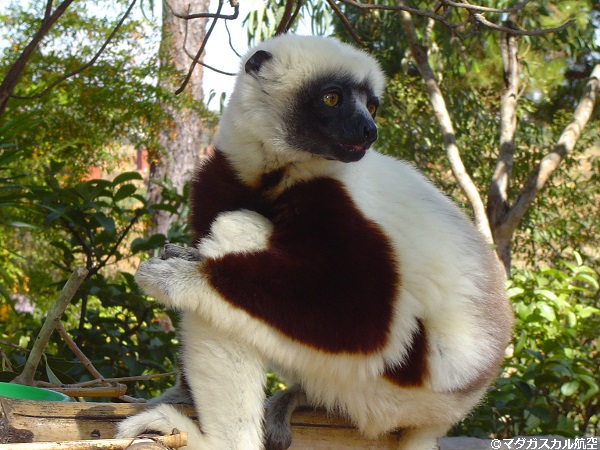 マダガスカル固有種のサル。手足が発達しており、枝から枝へ軽快に跳び移り、地上ではユニークな横跳びを見せます。神聖な生き物と崇められてきました。