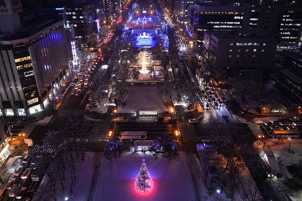 大通公園会場には、シンボルオブジェが設置されるほか、南北には札幌駅前通を会場に、東西には南一条通を会場に、立木装飾が美しくきらめきます。