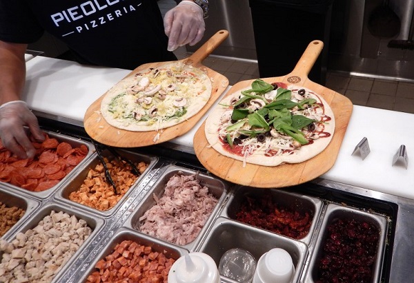 生地→ソース→チーズ→野菜や肉などのトッピングを自由に選び…