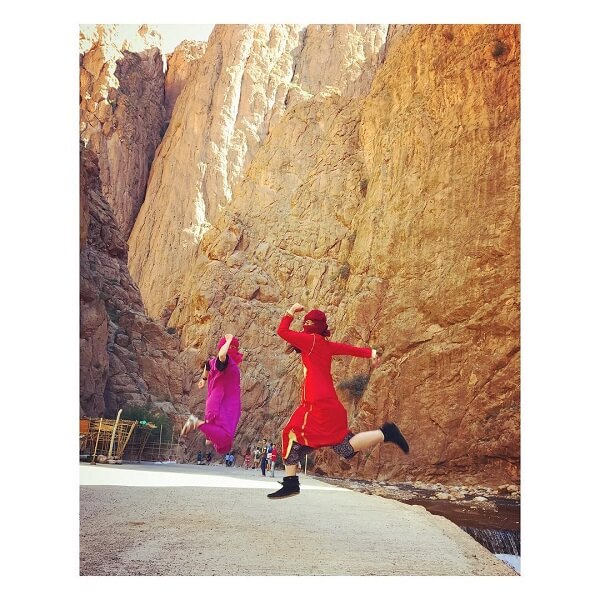 ご本人コメント(抜粋)「#Morocco × W jamping Todra Gorge*モロッコの秘境 トドラ渓谷 *想像以上の絶景に感動*私たちも民族衣装のカフタンに着替えて出陣*間違いなく*ジャンプ決めちゃうよね*ちなみに背景の画角に収まりきらない壮大な岩が先までずっと続いていて圧巻でした。」