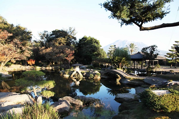 島津家19代目の島津光久(しまづ みつひさ ※注2)により、1658年に築かれた島津家の別邸。雄大な桜島と錦江湾(きんこうわん)を庭園の景観に取り入れた借景が魅力で、「天下の名園」とも言われます。