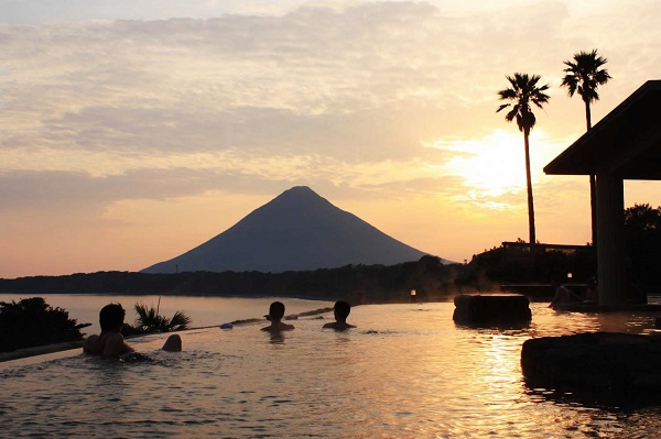 「たまて箱温泉」の露天風呂は、目の前に雄大な海と開聞岳(かいもんだけ)