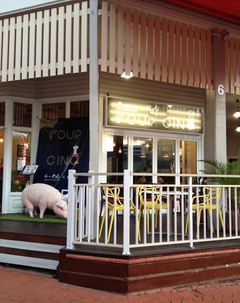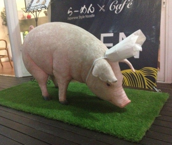 ラーメン屋とカフェが、まさかの合体したお店!お洒落なオープンカフェ風の店内。入り口にいる真ん丸としたブタさんが目印です。店員さんも、清潔感ある白い制服を着ており、ここでラーメンが食べられるとは思えない雰囲気です!