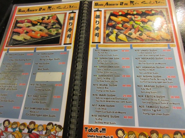 お勧めは、マグロ(TORO)!1皿2貫で、VND28,000(約125円)くらいです。マグロ以外にもネタも豊富で、ついつい頼んでしまいます。