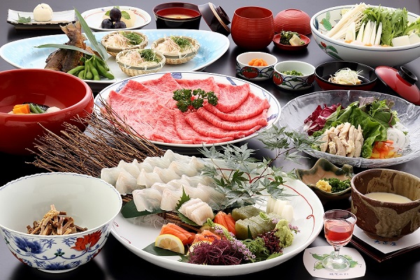 宿泊先では、特選牛など地元の厳選素材を使った夕食を堪能!
