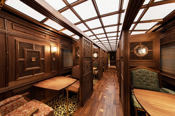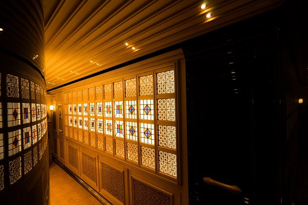 1号車と2号車をつなぐ通路は、まるで博物館のよう…列車の通路とは思えない豪華さ!その他、トイレや洗面台などもとにかく豪華絢爛で、車内を楽しむことができます。