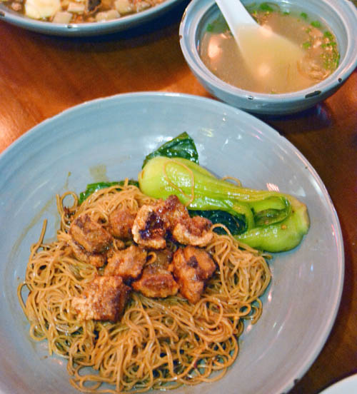 オススメは、麺の上に、カリッカリにローストされた厚切りの豚肉がウマい!上海ヌードル(Rp.55,000※約440円)。