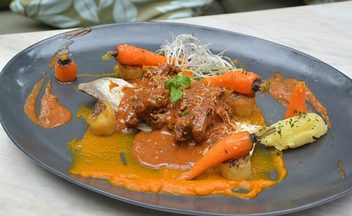 お肉が柔らかく、トロトロです。カボチャのソースがほんのり甘くて美味!お肉にも野菜にもよく合いますよ。