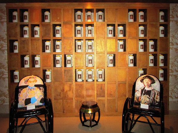 中国の王朝時代を思わせる家具や仏塔で、モダンな入り口。