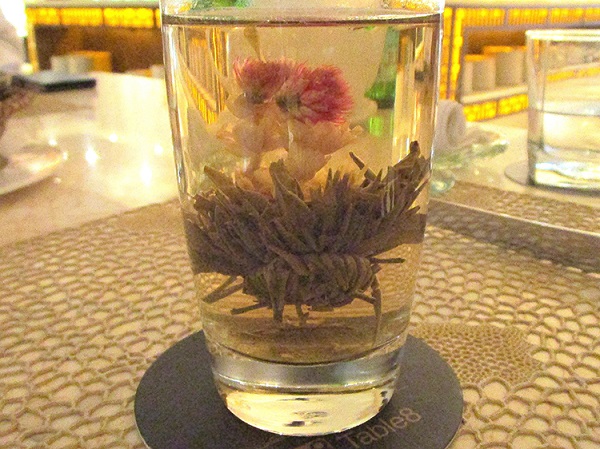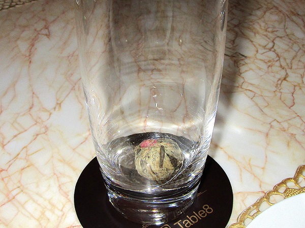 グラスの中に入っているボールのようにまとまった茶葉に、お湯を注いでもらうと…