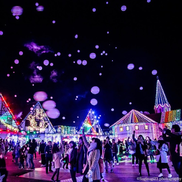 5万㎡の敷地に約250万級の輝きが夜のドイツ村を彩ります。 音に合わせてイルミネーションが変化する「音と光のショー」や、観覧車・展望台から見る3Dイルミネーションなど様々な光の演出をお楽しみいただけます。
