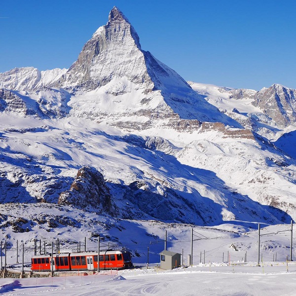 誰もが憧れを抱く凛とした佇まい。天を貫くような気品溢れる美しい尖峰。凛とそびえる美しい姿から"アルプスの女王"と称されるマッターホルン。雪に覆われた尖峰はひときわ美しく、世界中からその姿を眺めるために多くの人が訪れています。ハイキングや展望台など、色々な角度からその表情を眺めてみてはいかが?マッターホルンの姿を見ながら滞在できる村ツェルマットは、晴天の日が年間約300日とアルプス観賞にも適しています。村にはガソリン車の乗入は禁止されているので、空気もきれいで澄んでいます。隣の村のテーシュからはシャトル列車で約12分。多くの観光客がこのルートでツェルマットに入ることになります。