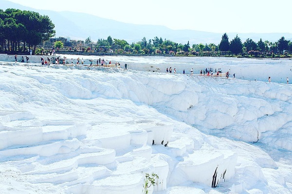 トルコ西部デニズリ県に広がる石灰華段丘。ヒエラポリス遺跡とともに複合世界遺産に登録されている。パムッカレとは「綿の宮殿」というトルコ語。綿花の一大産地であったことに由来している。地下熱で温められ湧き出た温水中から炭酸カルシウムが沈殿し、純白のような景観を作りだしている。そのパムッカレの一番上にあるのが、ヒエラポリス遺跡。ローマ帝国の温泉保養地として栄えたが、1354年の大地震で完全に廃墟と化しました。