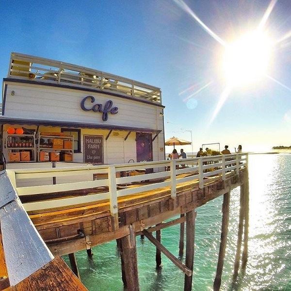 サンタモニカから車で約20分、マリブビーチは静かな落ち着いた雰囲気です。そのビーチにマリブピアはあり、桟橋の先端にあるのが、「MALIBU FARM PIER CAFE」です。海の上に浮かんでいるようなカフェで、海を眺めながらのんびり過ごすのにピッタリです。