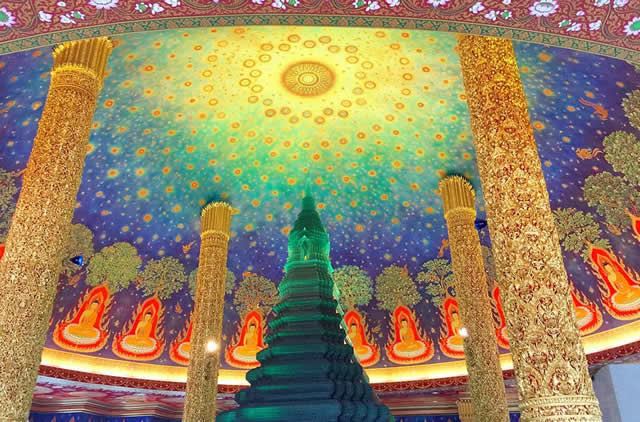 館内の1~3階には仏具などの展示がされており、4階まであがるとエメラルド色をした仏塔があります。ドーム状の天井には写真のような神秘的な画が描かれています。まるで宇宙のような幻想的な世界観が表現されています。