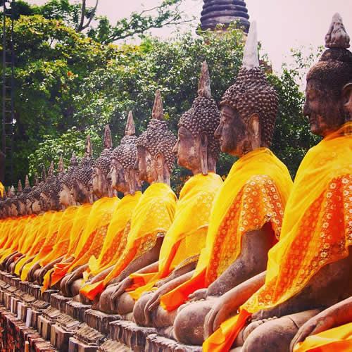 草むして崩れかけた遺跡群や、頭を切り落とされた仏像が、凄惨な歴史を今に伝えます。3人の王の遺灰が納められたワット・プラ・シー・サンペットは、アユタヤで最も重要な寺院。時が止まったような廃墟の中で、静寂が胸に迫ってくるようです。