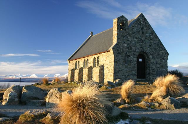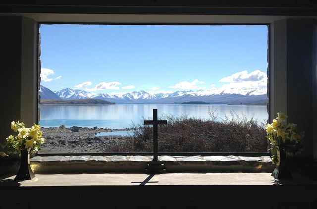 湖畔に佇む石造りの教会「善き羊飼いの教会」は、テカポ湖を代表する観光名所。大きな窓からは十字架の向こうに湖と山々が見え、美しい絵画のような景色が広がります。
