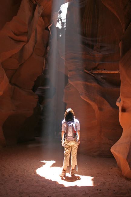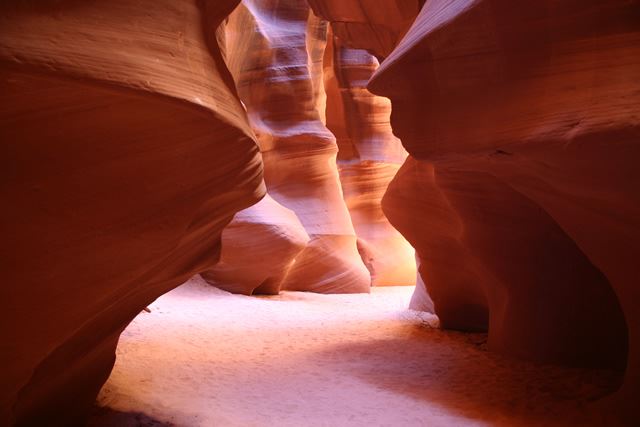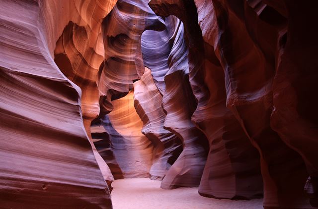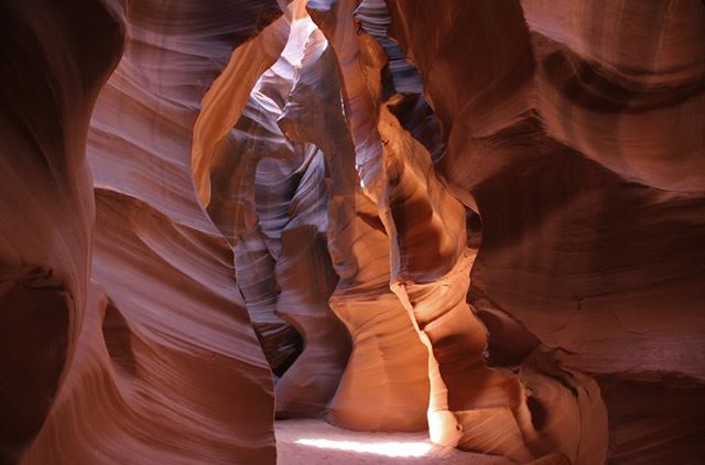 ホースシューベンドから車で約10分の距離にある「アンテロープキャニオン」。アメリカの南西部に先住するインディアン部族・ナバホの言葉で「水が岩を流れる場所」という意味です。もともとはロッキー山脈が隆起してきた際に出来たコロラド大地の一部の柔らかい砂岩が、水に侵食されて出来たもので、何百年と侵食を繰り返して創り上げられた谷です。ナバホ族が住むナバホ国内にあるため、以前は許可証がないと入れず、限られた地質学者や写真家のみが知る秘境で、観光地化されたのはつい1990年代に入ってからなんですよ。