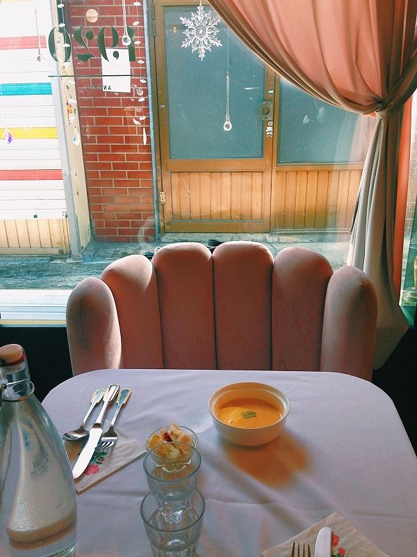 そして店内に入って目をひくのは貝殻の様なフォルムが可愛いピンクのチェア。テーブル席でも1人掛けのソファに座れるので贅沢な気分に。毎回変えてくれる真っ白なクロスのテーブルセッティングにもテンションが上がります。白と黒のレトロなタイルもクラシックでとても素敵でした。ランチでセットになっているかぼちゃのポタージュも美味しかった!