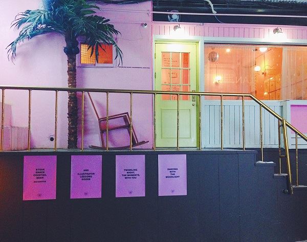 外観からフォトジェニック!ヤシの木のしたにロッキングチェアが置いてありオススメのフォトスポット。ピンクの壁にイエローのドアのコンビネーションがとても可愛いかったです。昼間だと、もっとカラフルでトロピカル感が出るので、太陽が出ている間に行くのがオススメです。