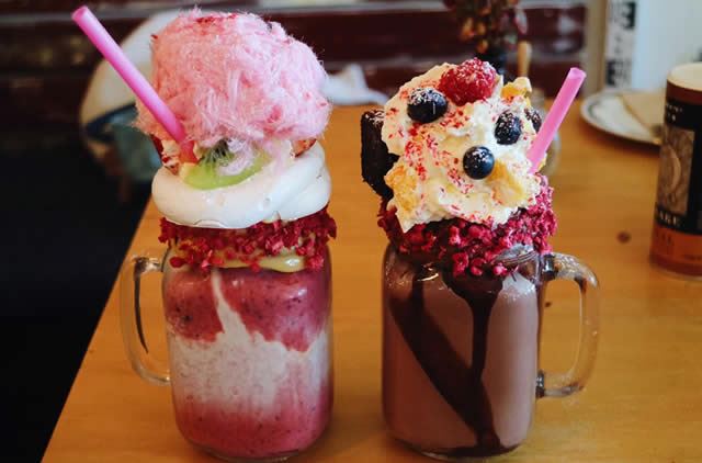 とっても甘いですが、見た目が可愛くて友達と別々の種類を頼んでシェアをしながら食べる事をお勧めします。左側はベリー、上に乗ってるのはドーナツの上にわたあめ。右側はチョコレート、上に乗ってるのはガトーショコラです。