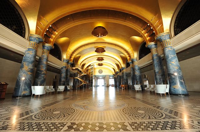 日の光があたって一番綺麗に輝く22.5金の金箔を、5cm間隔で一枚ずつ張り付けたロビーの天井は圧巻です!