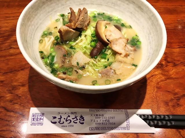 鹿児島市内で早速ランチを頂きます。昭和25年創業の「こむらさき」で、黒豚チャーシュー入りラーメンを注文。チャーシューの他に青ネギ、珍しいキャベツ、椎茸がトッピングされています。コクのあるスープが、細麺によくからんでとっても美味しかったです。