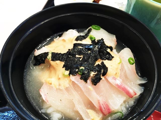 朝食でおすすめしたいのが、「真鯛潮(うしお)茶漬」です。朝一で〆た真鯛のお刺身がプリプリでたまりません!早く食べたい気持ちが先走り、出汁をかけ忘れるという痛恨のミス!海苔は後からかけた方が見栄えはいいですね。
