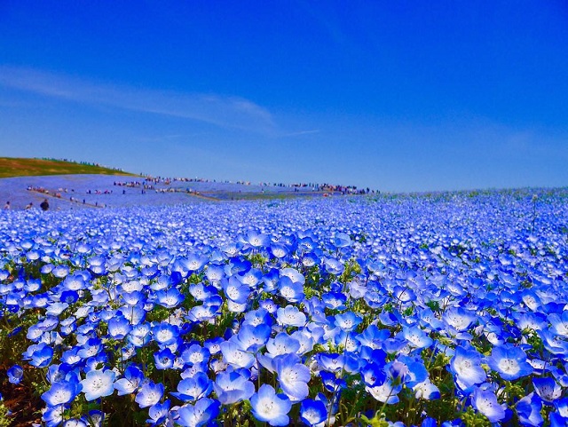 国営ひたち海浜公園の春の風景としておなじみの、幻想的なネモフィラハーモニー。約3.5haもの広大な“みはらしの丘”一面に、 450万本のネモフィラの花が広がります!360度、見渡す限りのブルーの世界は、まるで地上を離れて空中散歩をしているかのよう…。 可憐なネモフィラの花と、青空と、そして海が見せてくれる日本最大のパノラマ絶景は、毎年多くの人の目と心を癒し、楽しませてくれています。