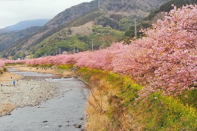 2月上旬から3月上旬に開花する早咲きの桜。花は桃色か淡紅色で、ソメイヨシノよりも桃色が濃いのが特徴です。名前の由来となった静岡県の河津町では、1981年より河津