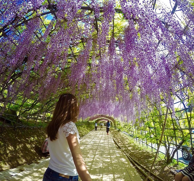 1977年に開園した私営の藤園で、6,000平方メートルもの広大な園内には、野田長藤、口紅藤、八重など約20種類150本の藤が咲き、訪れる人々を楽しませます。ゴールデンウィークの時期が見頃となり、紫と白の花が咲いた、長さ220mと80mの2本の見事な藤のトンネルを見る事ができます。入園料は開花状況に変わるようで、例年最大1,000円となります。