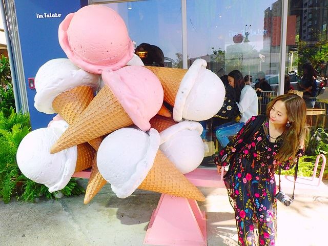 カフェや美術館などがある、魅力がいっぱいの台中の街♪中でも大人気のアイスクリーム屋さん「I'm Talato」この大きなアイスクリームのオブジェが目印!人気ゆえ中に入るには整理券が必要なので、