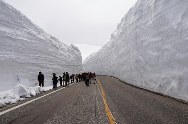 標高2,450mの富山県立山・室堂平は、世界でも有数の豪雪地帯。ひと冬で約8mもの積雪があります。「雪の大谷」は、降り積もった雪をブルドーザーで除雪した際にできる壁なのです。真っ白な雪の壁が約500mも連なる絶景。雪の大谷は吹き溜まりのため積雪がとても多く、その高さはなんと20m近くになることも。