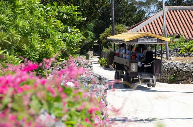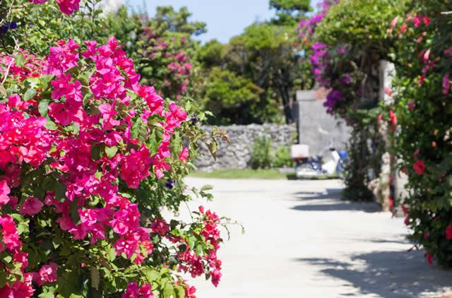 そして赤瓦の屋根と石垣の家々は、白砂が敷き詰められた道で結ばれています。