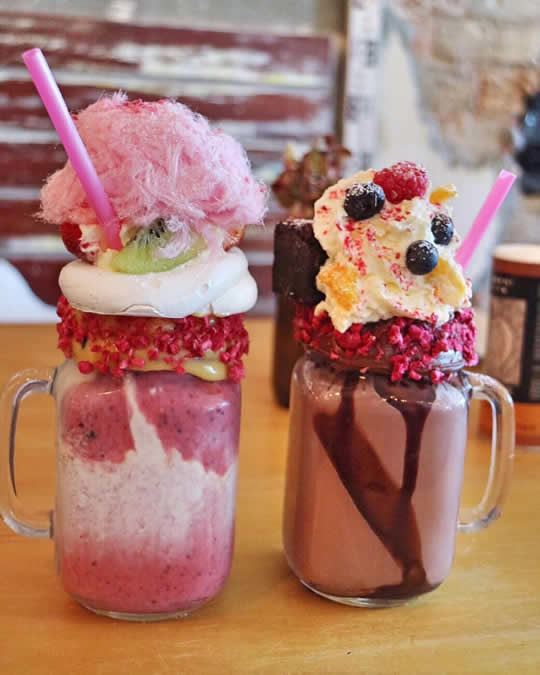 左側はベリー、上に乗ってるのはドーナツの上にわたあめ。右側はチョコレート、上に乗ってるのはガトーショコラです。見た目が可愛く、思わず写真に撮りたくなる一品です。友達と別々の種類を頼んでシェアをしながら食べるのがおすすめ!壁一面に書かれた顔の絵など、店内にもたくさんのお洒落インテリアがあるので楽しめます。