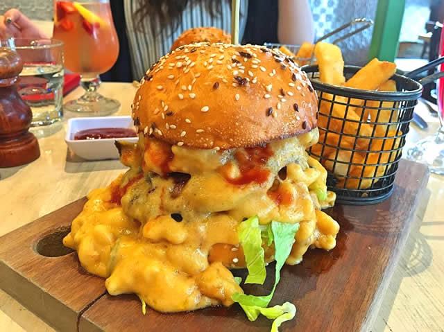ハンバーガーの中にチーズたっぷり、マカロニが入っています。バンズでおさえられないほどの勢いではみ出る具。ブリオッシュ生地のバンズにソースはオリジナルで、見た目はワイルドですが、美味しいと評判です。カロリーは気にせず美味しくいただきましょう!
