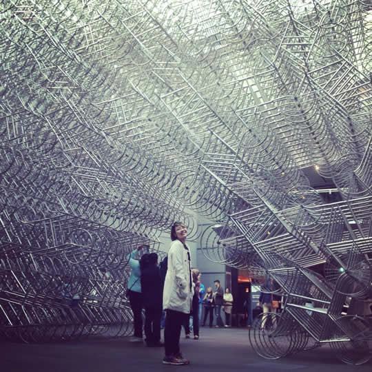 自転車の金属部分で作られたアートといった独創的なオブジェや美しいステンドグラスの天井など、見どころ満載!常設部分は入場無料なので、気軽に芸術鑑賞を楽しむことができます。