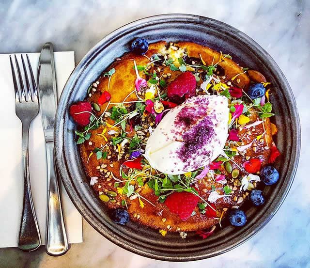 カラフルな花びらの他にブルーベリー、苺など、フルーツもたっぷり♪ホットケーキの周りは少しサクッとしており、下の部分はメープルシロップでしっとりとした食感を味わえます。見た目も鮮やかなこのホットケーキ目当てに行列が出来るほどの人気です。お店の外観も真っ白でお洒落です。