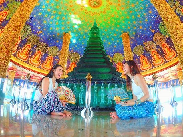 バンコクのトンブリー地区にある仏教寺院。館内の1~3階には仏具などの展示がされており、4階まであがるとエメラルド色をした仏塔があります。ドーム状の天井には写真のような神秘的な画が描かれています。まるで宇宙のような幻想的な世界観が表現されています。実は千葉県成田市に支院があり、日本との縁のある寺院です。