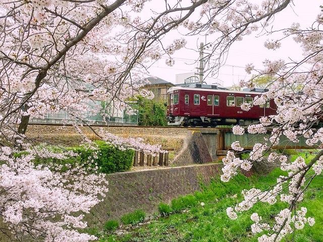 写真提供:@mapinessさん【投稿コメント(抜粋)】桜で有名な夙川にて川沿いを走る阪急電車をパチリ 車体のあずき色が桜にとっても映えます