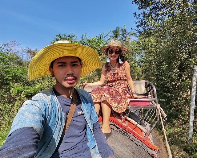 写真スポットではゾウ使いさんが下に降りていっぱい写真撮ってくれます。ゾウ使いさんの席にも座らせてもらいました。アクションカメラのFR100を渡したら何故かカメラ目線の写真に(笑)