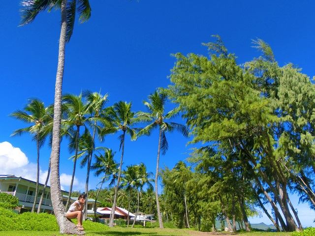 ワイマナロはヤシより杉みたいな木がほとんどですが、別荘やお家エリアに近い場所にはヤシがあって、住人がいらっしゃったら話しかけて仲良くなって写真を撮ってもらう事も多いです! (私の写る写真はほぼ即席カメラマンが撮ってくれたものです。)※カイルア経由のバスは19:00台まで