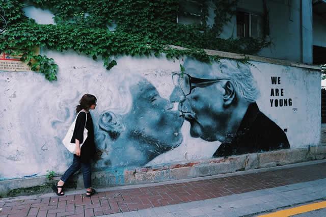 韓国の伝統家屋と現代風な壁画たちが調和したエリア。